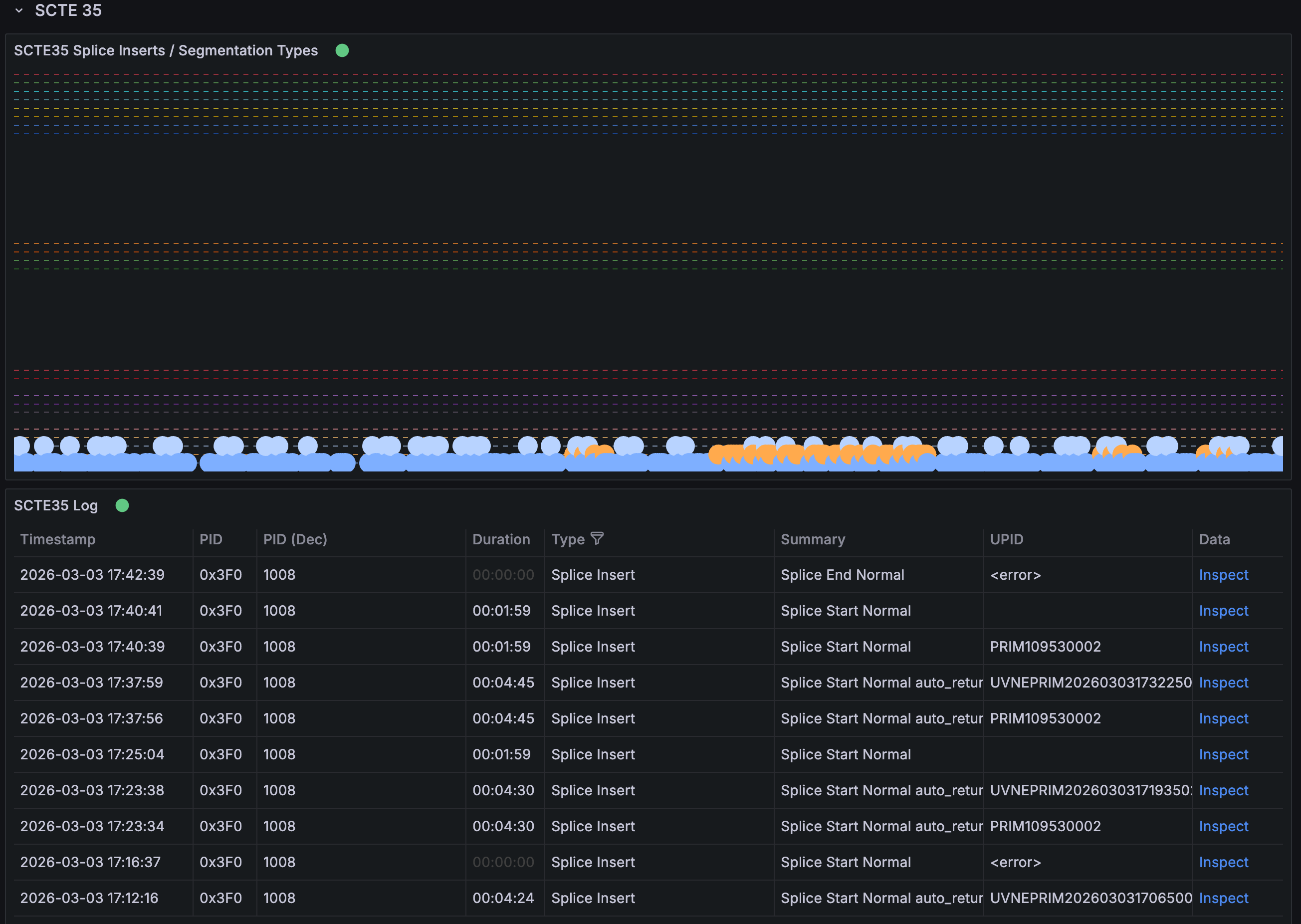 The SCTE 35 graph shows the occurrence of triggers, categorised by type. Each splice type is represented by a different dashed line. If “Data is missing a number field” or “No data” appears, no SCTE 35 triggers have been detected. The SCTE 35 Log provides detailed information for each trigger, including the CRC32 checksum and other relevant properties.