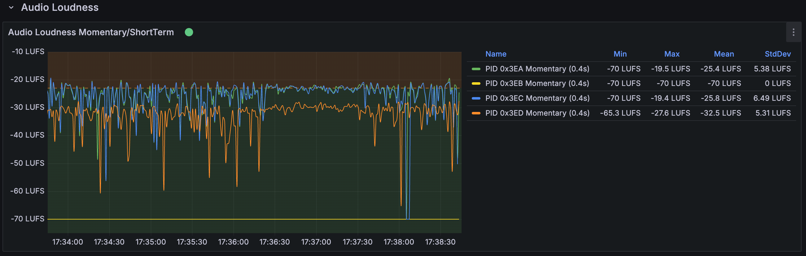 This graph displays loudness measurements over time for each audio channel in every audio stream, with momentary loudness measured over 0.4 seconds.