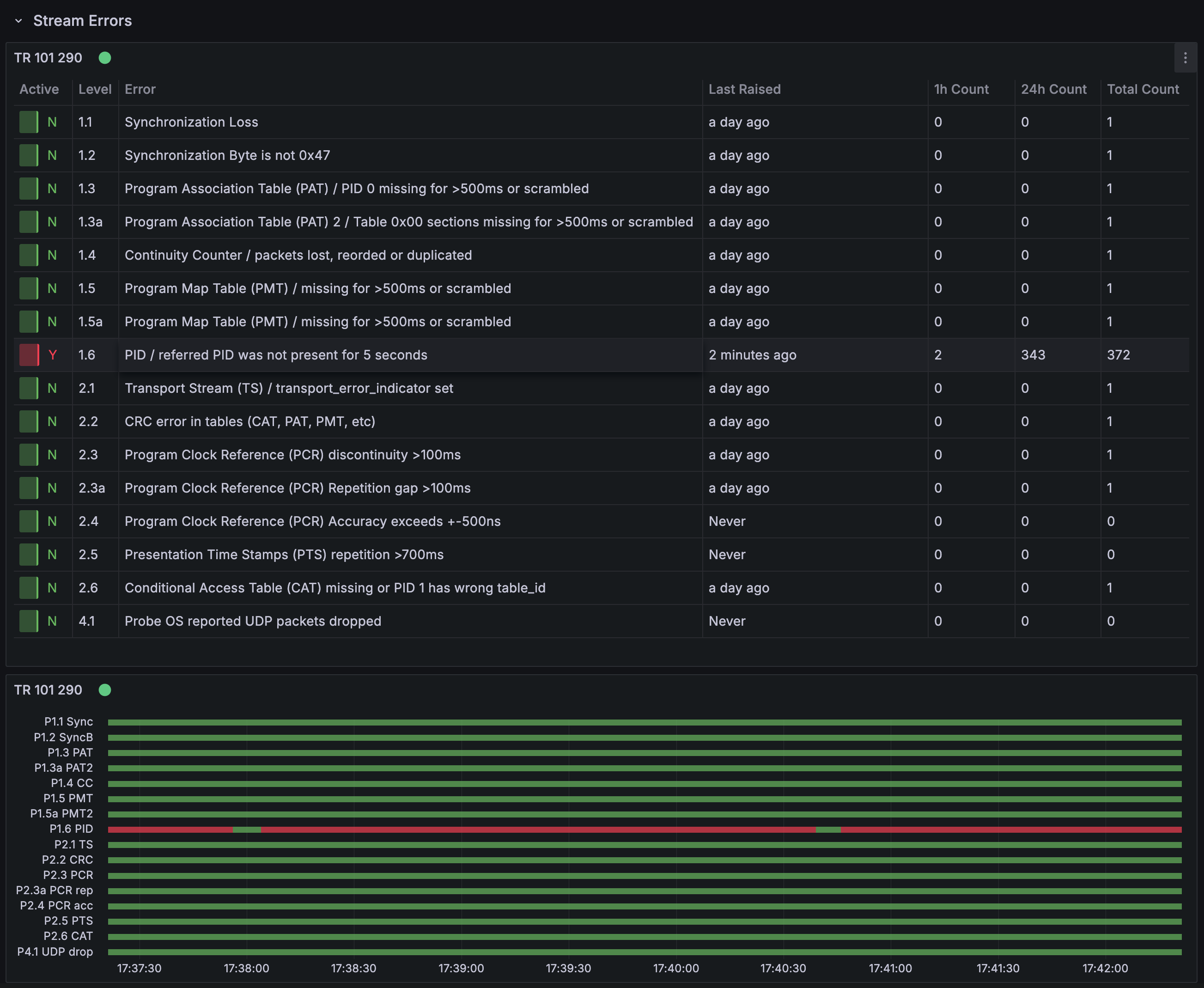 Stream errors are listed according to the TR 101 290 standard. If the dashboard displays “Data is missing a number field” or “No data,” this means no errors have been detected. Users can hover over any red error bar to view specific error details; for example, a priority one PID Error as defined by TR 101 290. A historical view is also show, for errors over time.