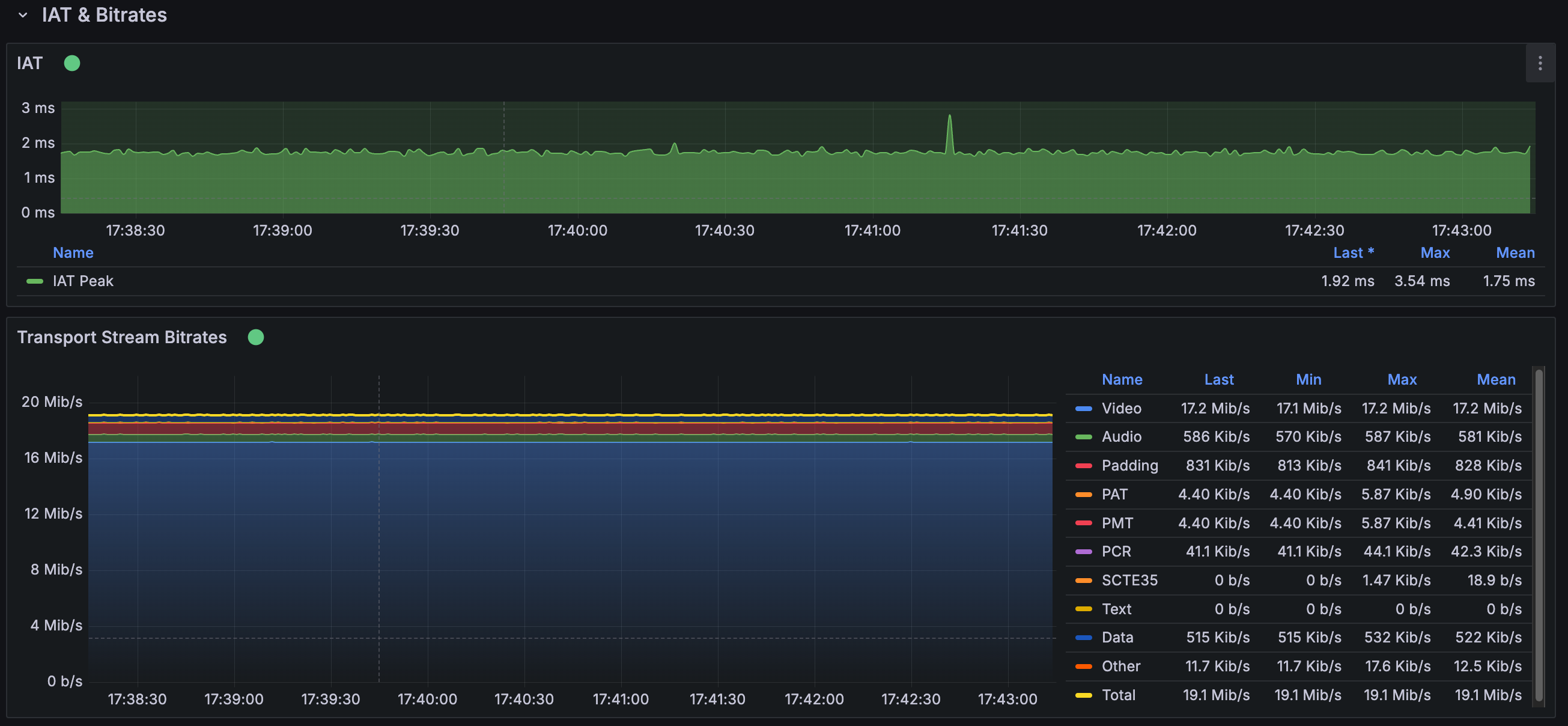 - IAT (Inter-Arrival Time): This metric measures the time between packet arrivals, which should remain constant and below a set threshold. The dashboard shows the peak IAT for each one-second measurement interval, as well as the maximum IAT recorded over all intervals.
